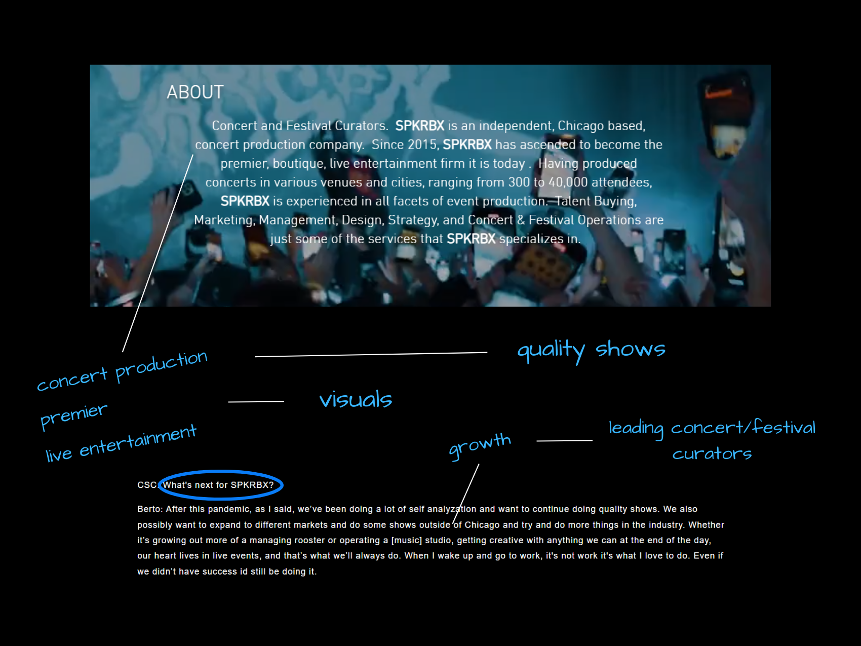 Concert and Festival Curators. SPKRBX is an independent, Chicago based, concert production company. Since 2015, SPKRBX has ascended to become the premier, boutique, live entertainment firm it is today. Having produced concerts in various venues and cities, ranging from 300 to 40,000 attendees, SPKRBX is experienced in all facets of event production. Talent Buying, Marketing, Management, Design, Strategy, and Concert & Festival Operations are just some of the services that SPKRBX specializes in.